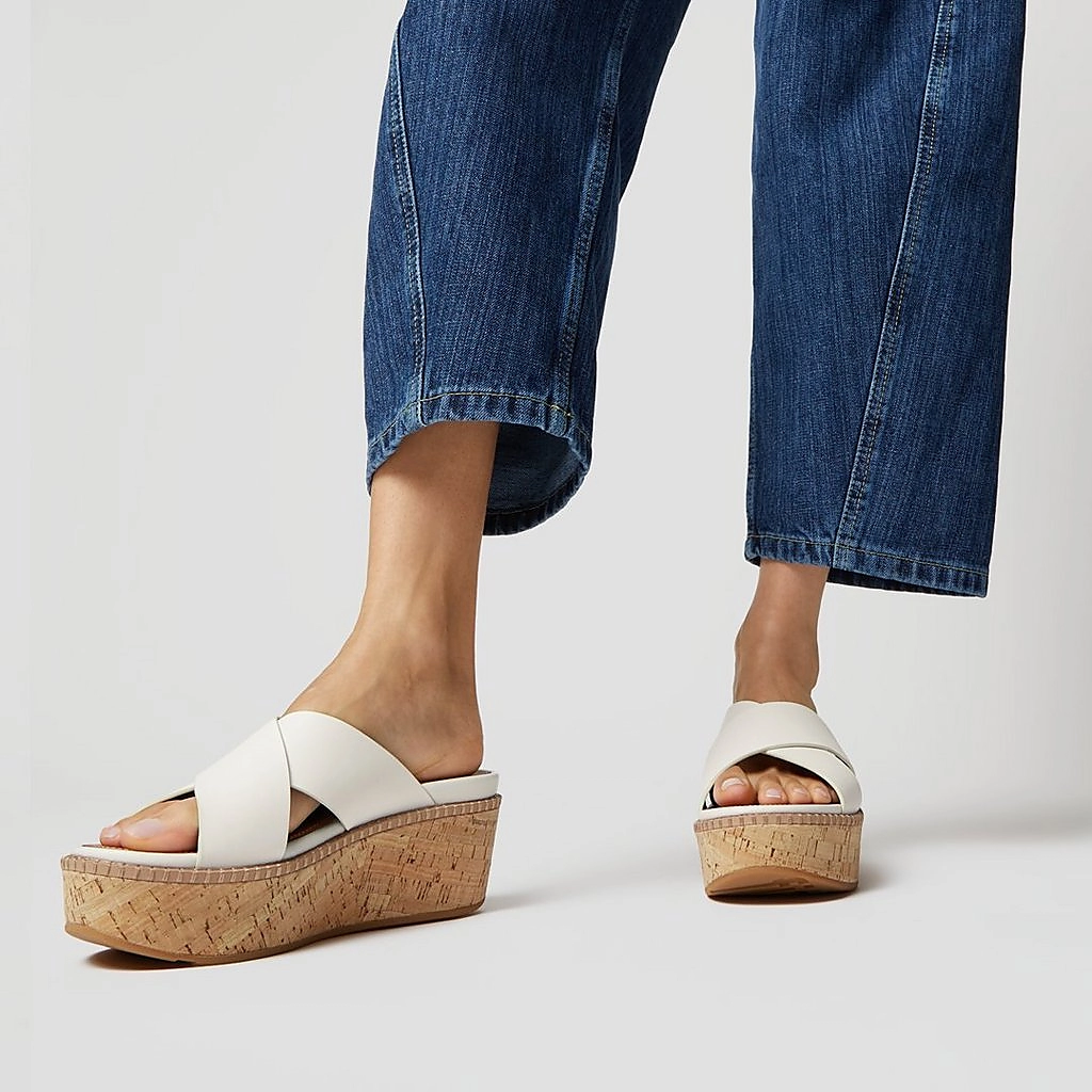 Elevate your look – in every sense – with these beautiful wedge slides. Wrapped in natural cork for a laidback-chic summery vibe. Wide crossover straps are fashioned in smooth high-quality leather. With statement stitching, on the leather welt around the top of the sole, giving a crafty feel. All-leather linings add to the refinement. On our high wedge sole: featuring our supercushioned triple-density Microwobbleboard™ tech inside a firmer shell for stability.